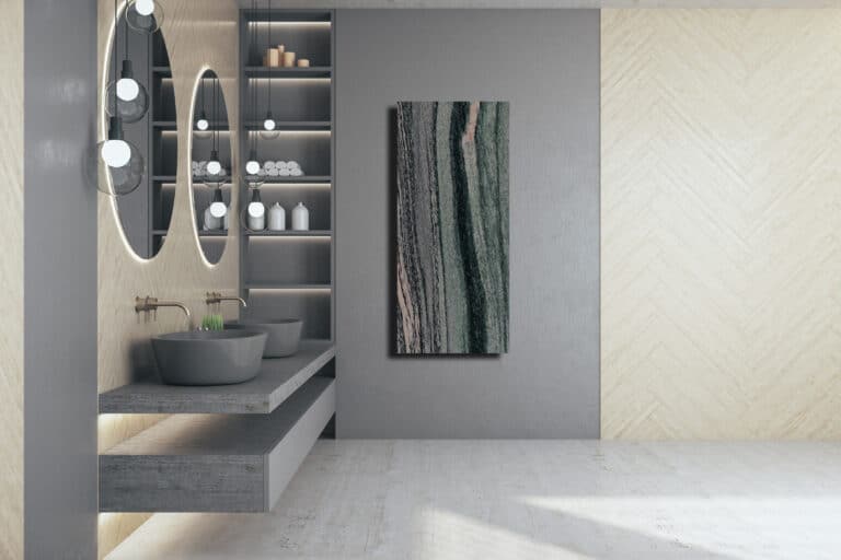 Atlantis is a natural stone from Norway with green, white, pink, and black as the base tone and softly flowing structures. Fine veining in gray, brown, or subtle blue gives the surface depth and dynamics. As a heating surface, Atlantis generates uniform radiant heat and impresses with its storage-capable material structure. The harmonious coloring fits ideally with warm wood surfaces and high-contrast room concepts.