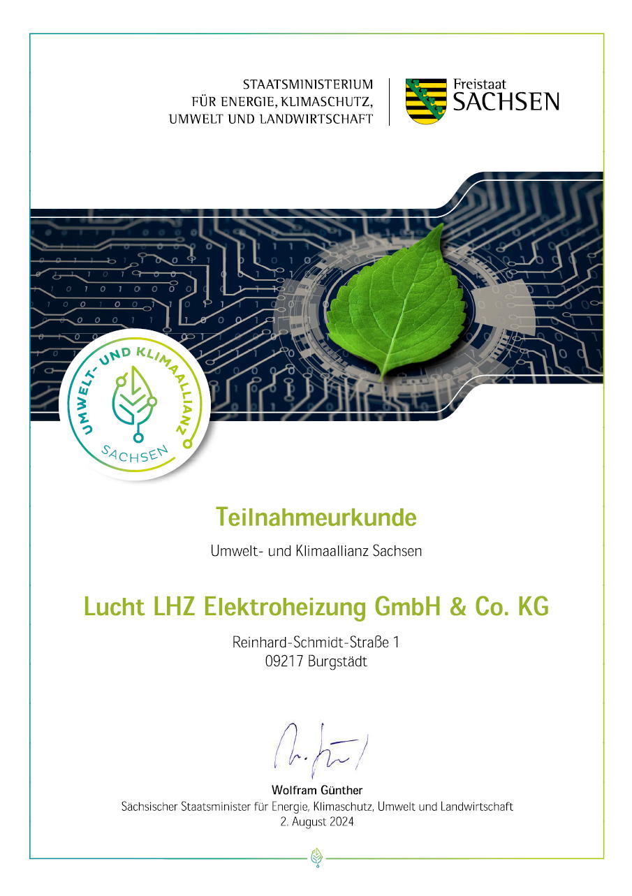 Lucht LHZ Elektroheizung GmbH & Co. KG has been an official participant in the Environmental and Climate Alliance Saxony (UKA) since August 2, 2024 for a period of three years. Inclusion in this renowned network confirms our ongoing commitment to sustainability and active climate protection.